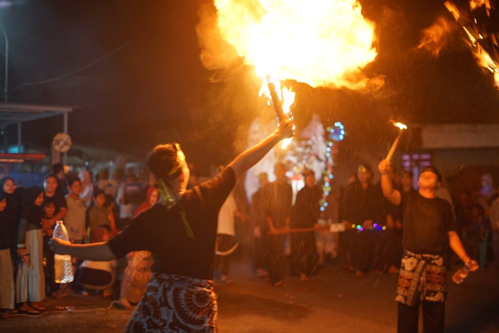 Rombongan santri berjalan mengelilingi desa Lebo seraya meneriakkan yel-yel dari masing-masing asrama. Suasana sangat meriah dan seru, bahkan barisan pawainya sangat panjang memenuhi jalan.